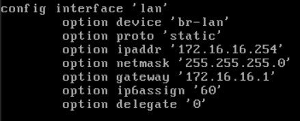 载入虚拟机后 vi /etc/config/network 将LAN的IP更改为主网段任意IP作为旁路由的网关地址,添加一行 网关gateway为主网段的网关。这里我使用.254作为旁路的IP。