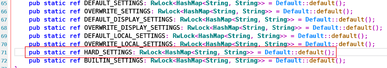 pub static ref HARD_SETTINGS: RwLock<HashMap<String, String>> = {