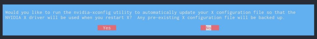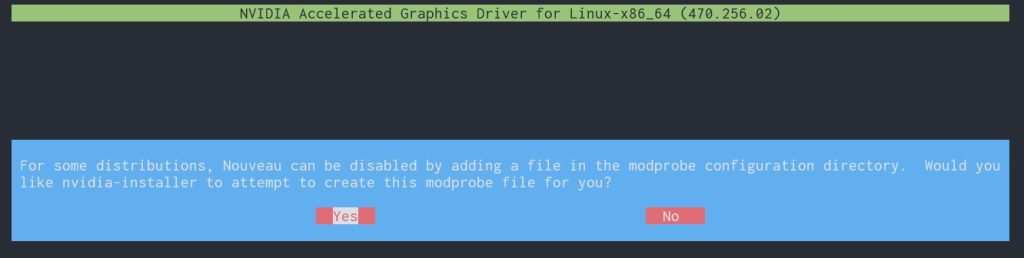选择 OK 后,程序会询问你是否希望由程序来将 Nouveau 驱动列入黑名单,这里选择 Yes ,就不需要自己手动操作了。