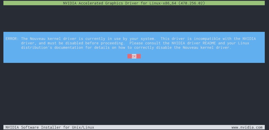 提示当前使用的是 Nouveau 驱动,不能与即将安装的 Nvidia 共存,需要预先禁用。 Nouveau 驱动的说明参考 这篇文章