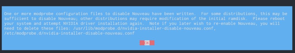 提示已经成功将 Nouveau 驱动加入黑名单,需要重启后再次运行安装程序。